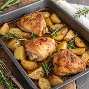 Sugerencia de imagen: Muslos de pollo dorados y papas asadas con romero en una bandeja para hornear.