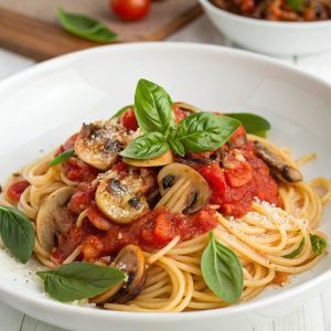 Sugerencia de imagen: Un plato de pasta integral con salsa de tomate fresco y hojas de albahaca.