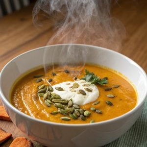 Sugerencia de imagen: Un tazón de crema de calabaza y zanahoria humeante, decorado con semillas de girasol.
