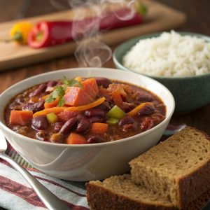 Sugerencia de imagen: Un tazón humeante de chili vegetariano con frijoles rojos, acompañado de arroz integral.