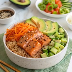 Sugerencia de imagen: Un vibrante poke bowl con arroz integral, salmón, aguacate y vegetales.