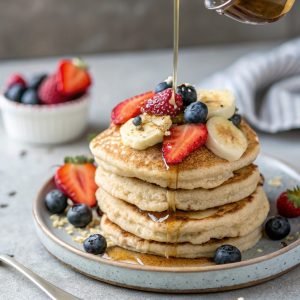 Sugerencia de imagen: Una pila de panqueques de avena y banano con rodajas de fruta fresca.