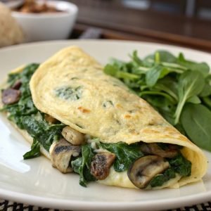 Haz un batido de 3 huevos con sal y pimienta, luego agrega espinaca y champiñones que han sido previamente salteados. Cocina en una sartén antiadherente a fuego medio hasta que se cuaje. Puedes acompañarla con una ensalada verde o pan integral.