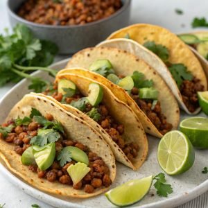 Sugerencia de imagen: Varios tacos de lentejas con aguacate y cilantro, listos para comer.