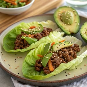 Sugerencia de imagen: Wraps de lechuga rellenos de carne picada y aguacate.